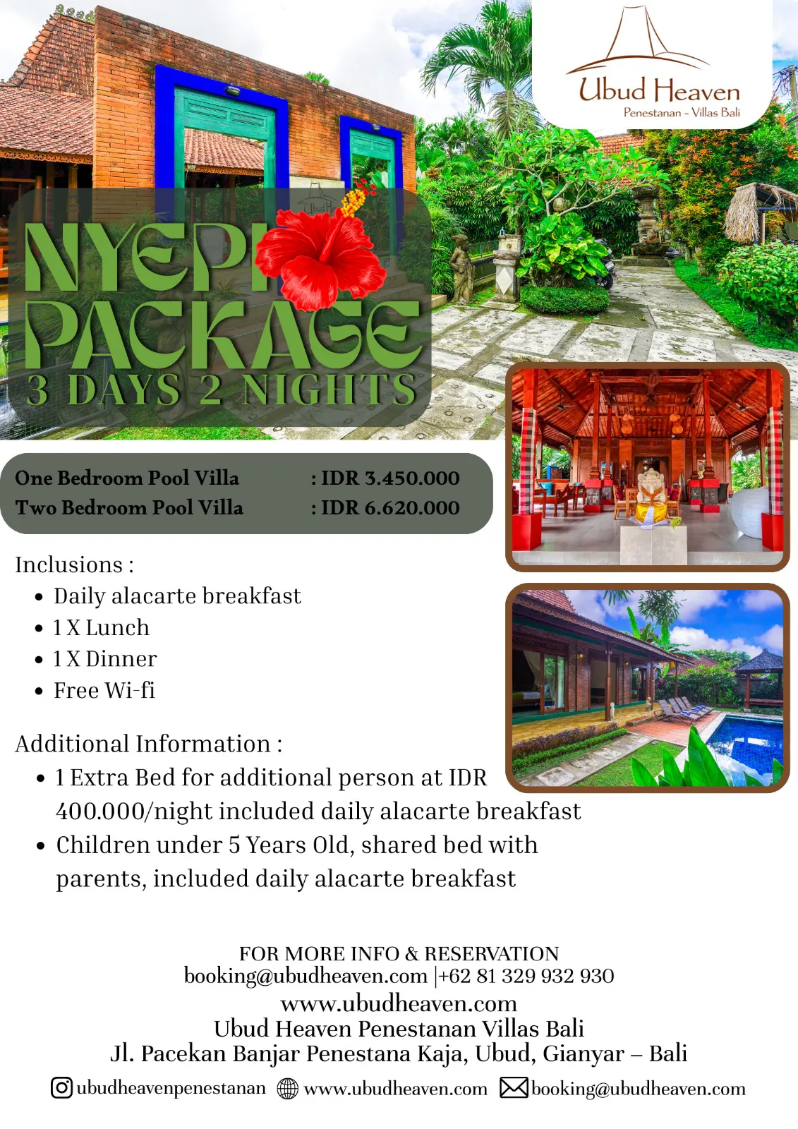 - For booking or asking promo code, please contact us by WhatsApp at (+62) 81 329 932 930 or Email at booking@ubudheaven.com